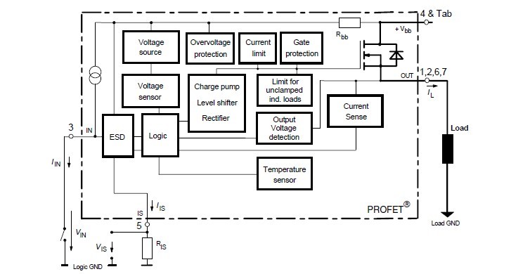 BTS50085-1TMA features: (1)Overload protection; (2)Current limitation; (3)Short circuit protection; (4)Over temperature protection; (5)Over voltage protection (including load dump); (6)Clamp of negative voltage at output; (7)Fast deenergizing of inductive loads; (8)Low ohmic inverse current operation; (9)Diagnostic feedback with load current sense; (10)Open load detection via current sense; (11)Loss of Vbb protection2); (12)Electrostatic discharge (ESD) protection; (13)Green product (RoHS compliant); (14)AEC qualified.